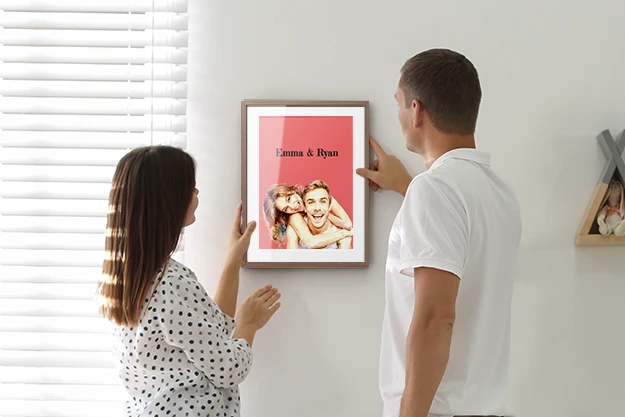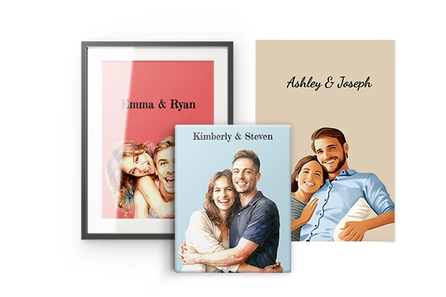 Once you’re happy with the design, your couple portrait can be printed as wall decor. Choose between canvas, a premium poster, or an elegant framed print with a white mat and glass cover. Each option highlights the artwork clearly and works well in modern living spaces.