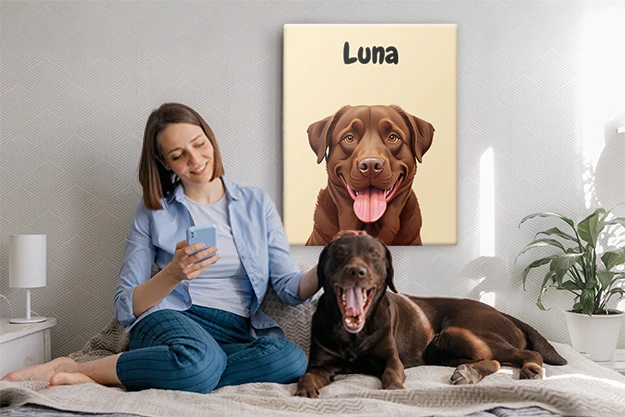 That empty space above the sofa or fireplace often feels hard to fill. A larger pet portrait, such as a 24" x 30" canvas, fits naturally there. Big pet prints tend to draw attention without feeling forced, and guests usually notice them right away. Seeing your dog or cat featured like this gives the room character that generic wall art simply doesn’t.