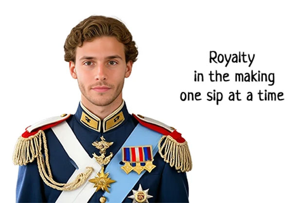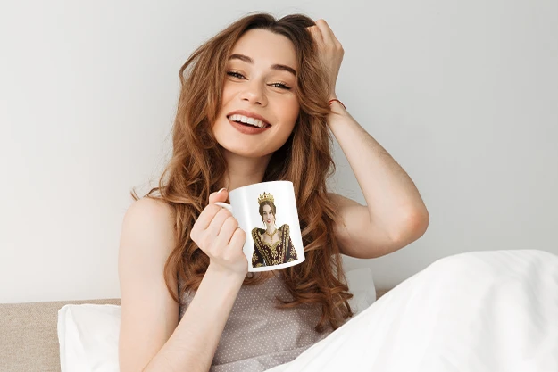 The finished royal portrait is printed on a ceramic mug designed for regular use. The print layout emphasizes the portrait while maintaining a clean, balanced appearance. This creates a custom photo mug that works both as a decorative item and as an everyday object.